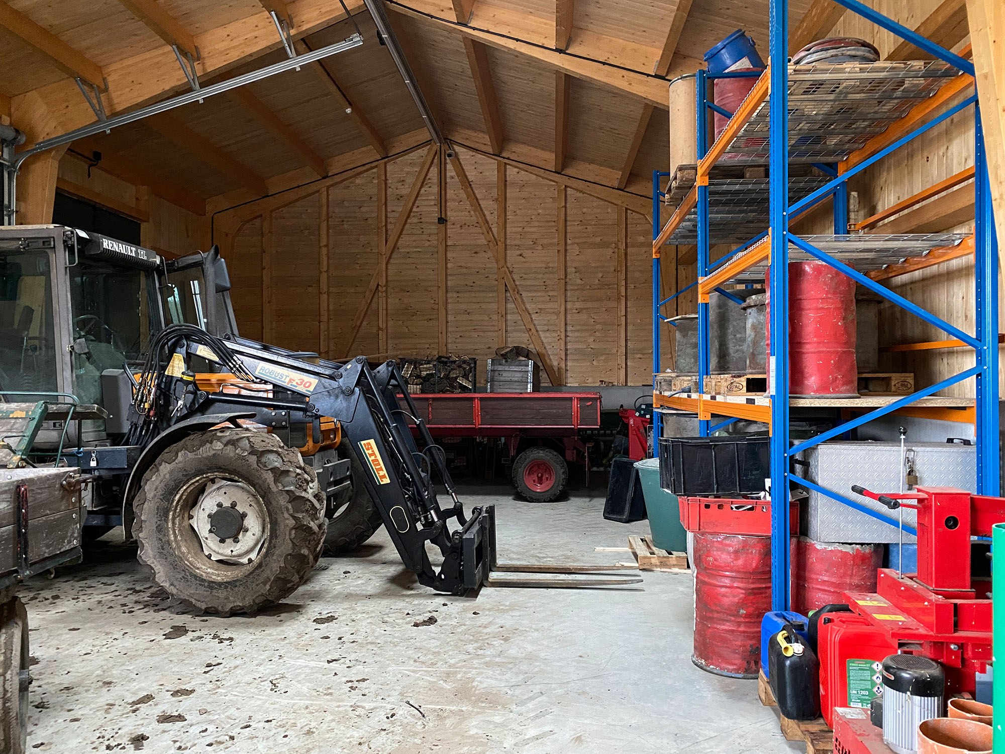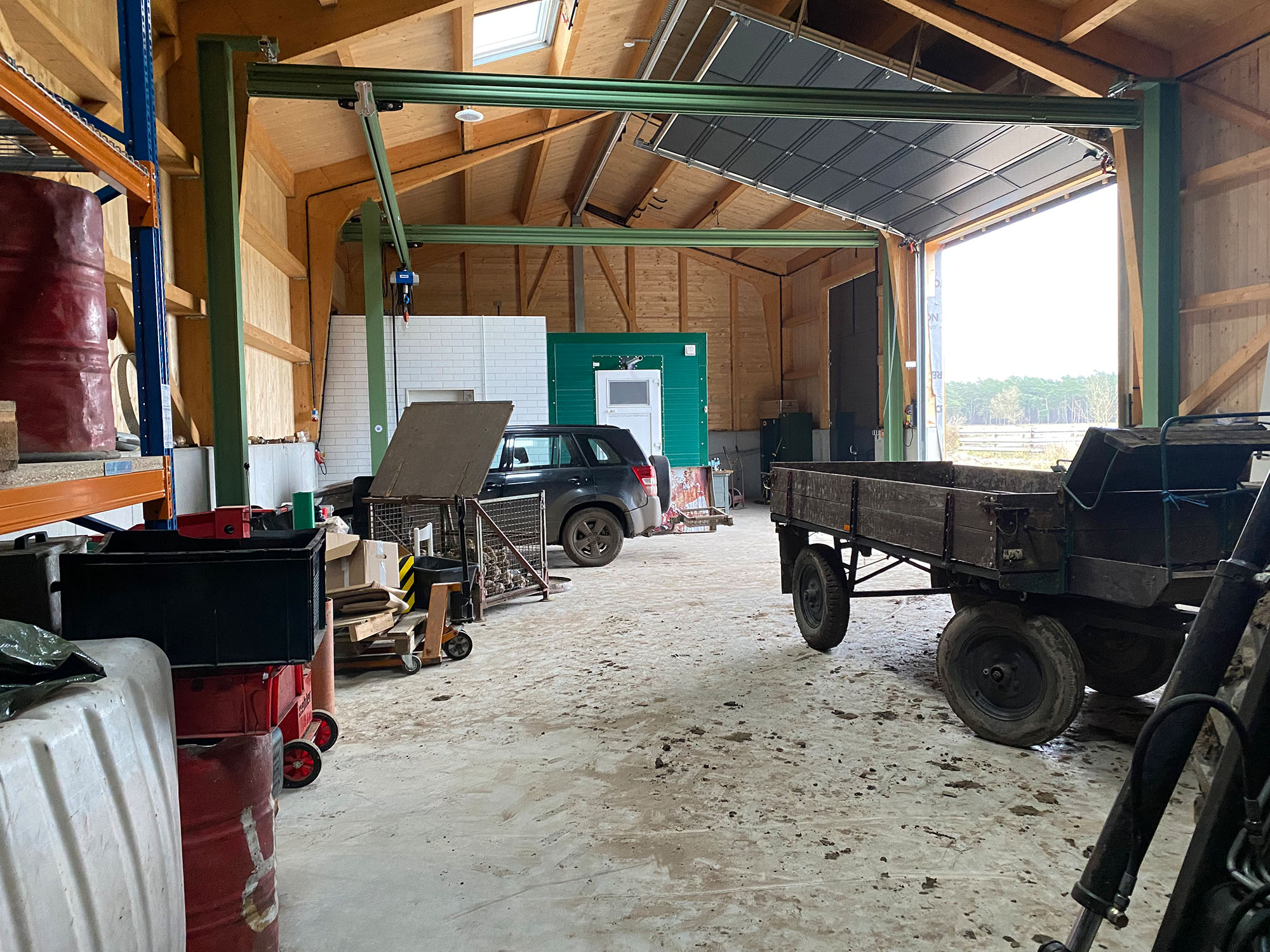 Das Herzstück des Anwesens bildet die eigene Hofstelle mit einem neu errichteten Wohnhaus (ca. 180 m² Wohnfläche, Fertigstellung 2024) sowie einer angrenzenden, freitragenden und vielseitig nutzbaren Halle (ca. 245 m², Fertigstellung 2023).